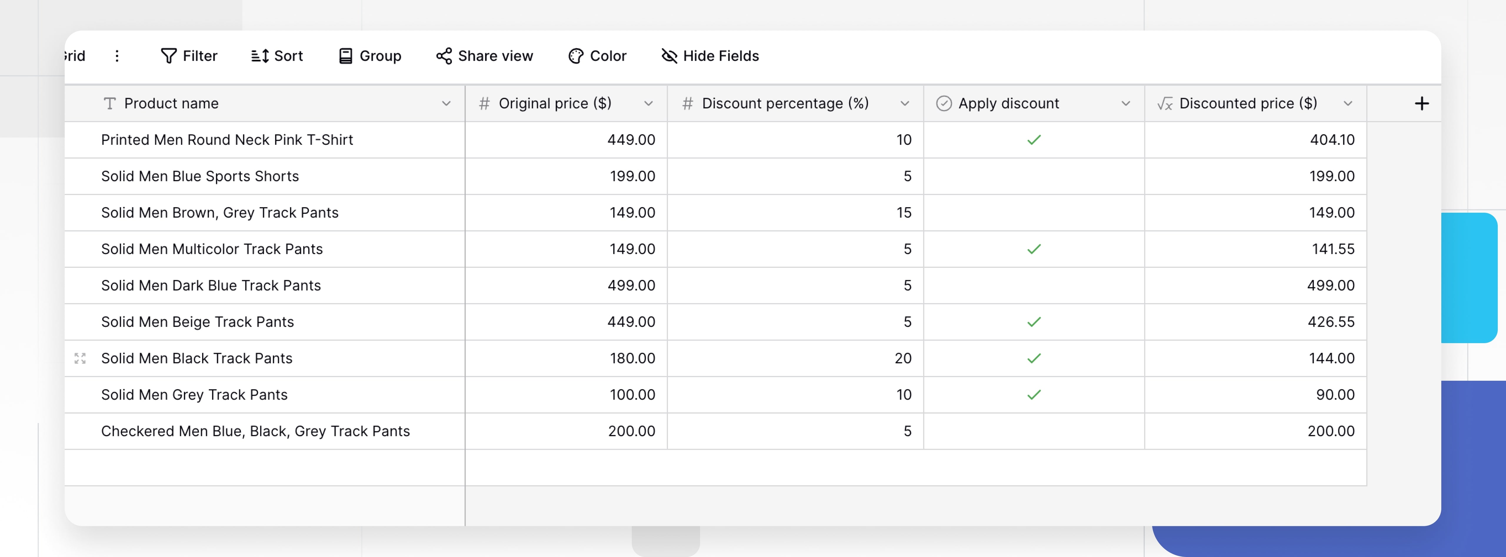 if(field(‘Apply discount’), field(‘Original price ($)’) * (1 - field(‘Discount percentage (%)’) / 100), field(‘Original price ($)’)) ``` Эта формула проверяет, нужно ли применять скидку. Если условие (Apply discount) истинно, вычисляется цена со скидкой, иначе выводится исходная цена.