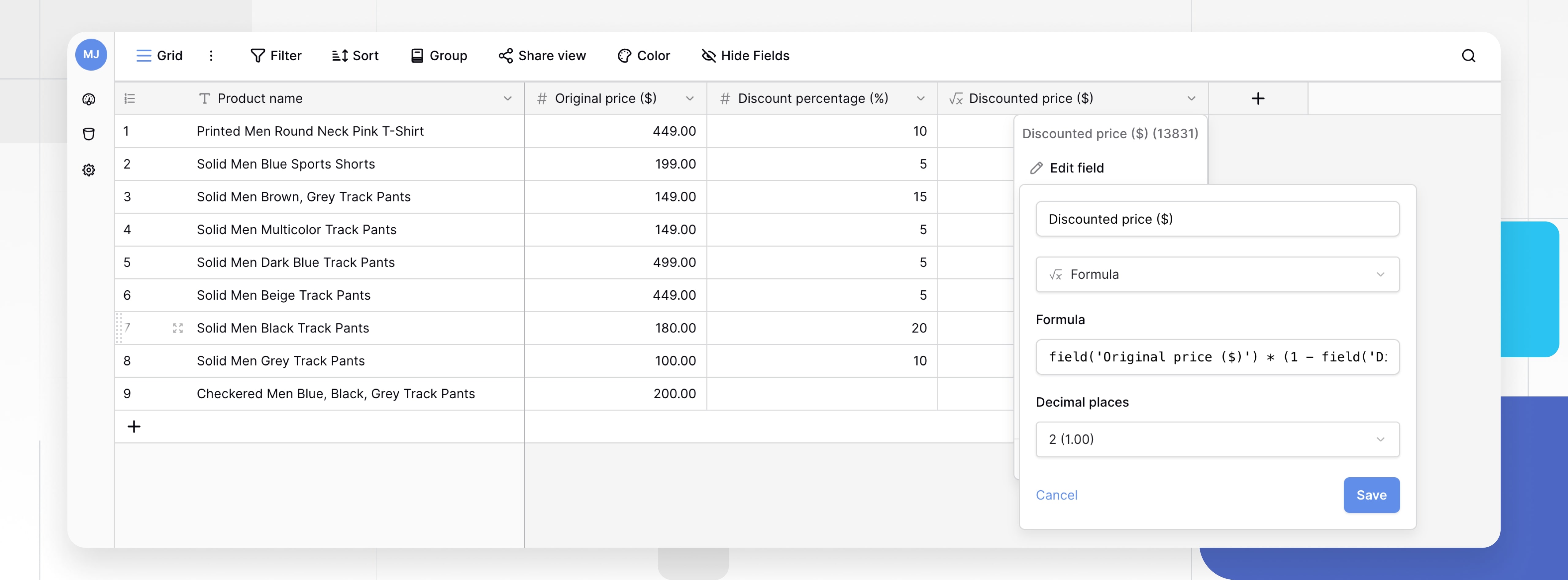 field('Original price ($)') * (1 - field('Discount percentage (%)') / 100)