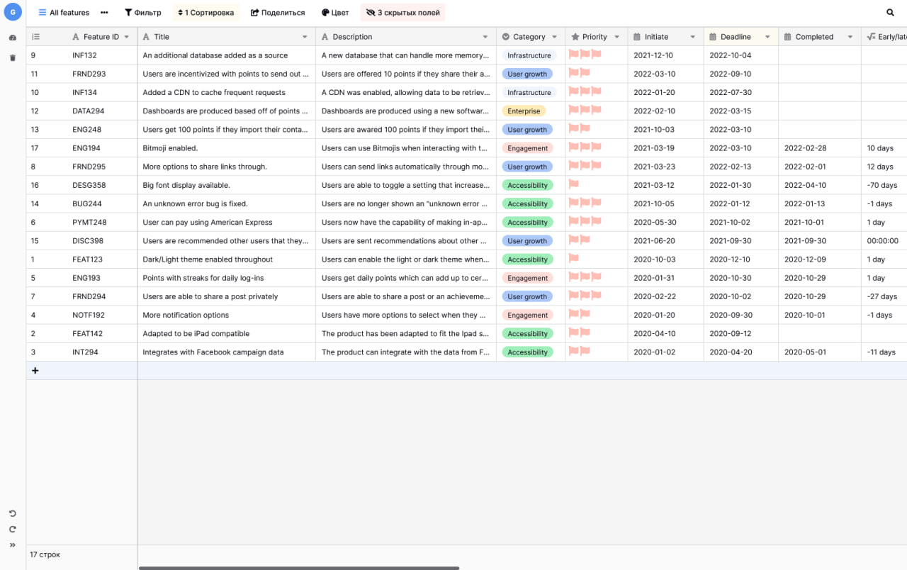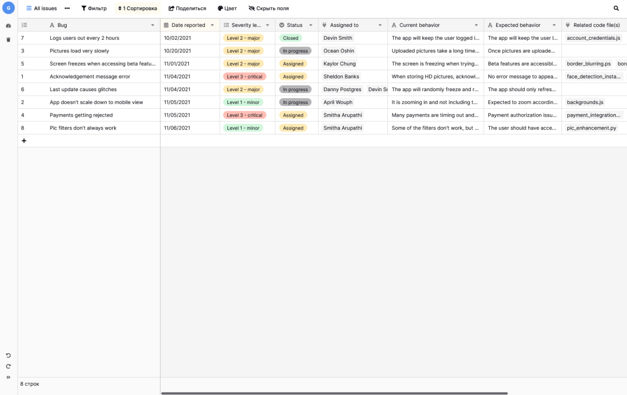 Ни один код не свободен от ошибок. Независимо от того, планируете ли вы исправить ошибку или выдаёте её за особенность, важно знать о ней. Датабаза предлагает шаблон трекера ошибок, который поможет вам в этом. Наличие централизованного места для отслеживания проблем позволяет выбрать того сотрудника, который владеет нужным языком программирования, чтобы оперативно решить проблему. Этот шаблон сокращает время, в течение которого пользователи сталкиваются с ошибками, благодаря простому отслеживанию, назначению и быстрому их устранению.